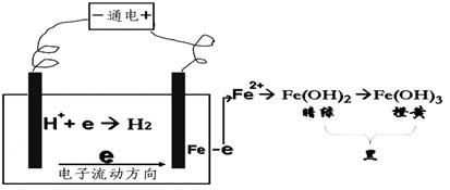目前市場(chǎng)上有商家出售標(biāo)榜能夠檢測(cè)水質(zhì)的電解器,宣稱根據(jù)水電解后的顏色變化來(lái)判斷水質(zhì)好壞。這些電解器通常有兩個(gè)電極,其中正極為鐵棒,負(fù)極為鋁棒,插入水中通電后,由于普通自來(lái)水為含有微量礦物質(zhì),使水可以導(dǎo)電,電極之間形成了一個(gè)電解池(如下圖所示)。