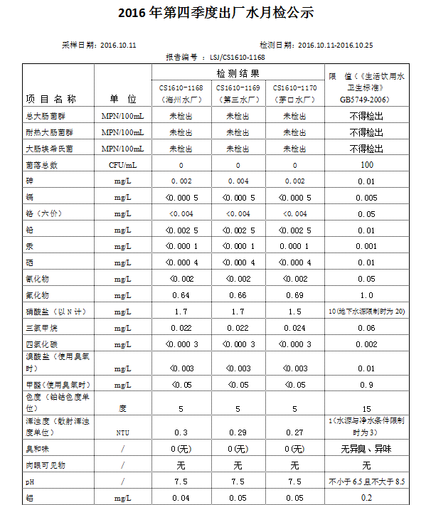 2016年第四季度出廠水月檢公示