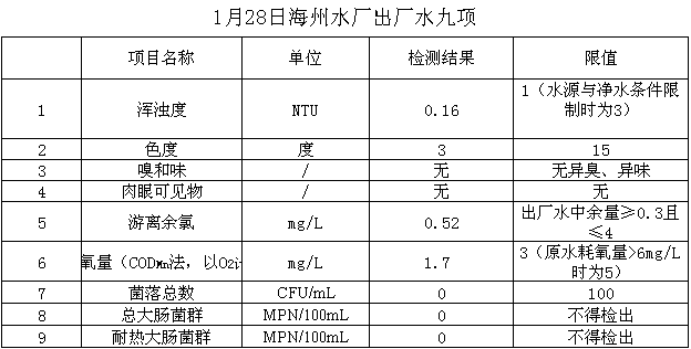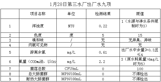 2018年1月28日出廠水水質公示