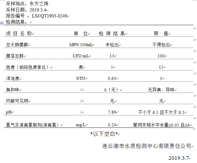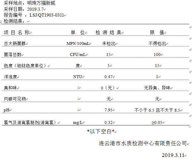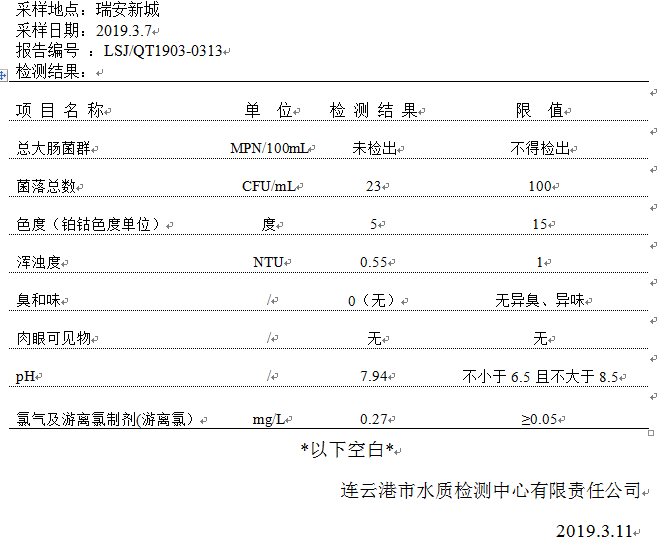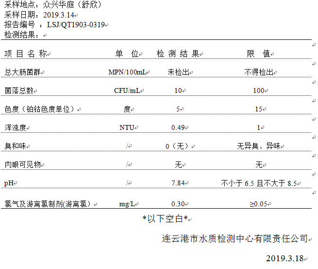 2019年3月二次供水泵房水質公示