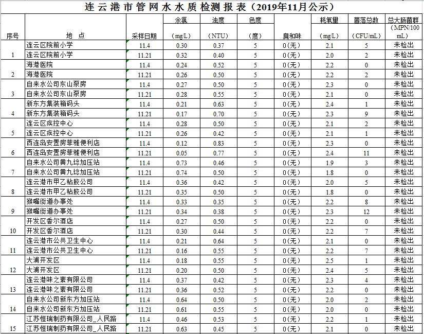 2019年11月管網水水質公示