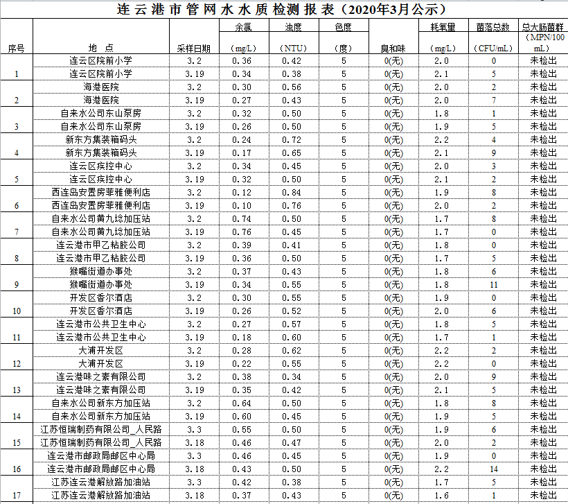 2020年3月管網(wǎng)水水質(zhì)公示
