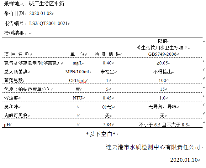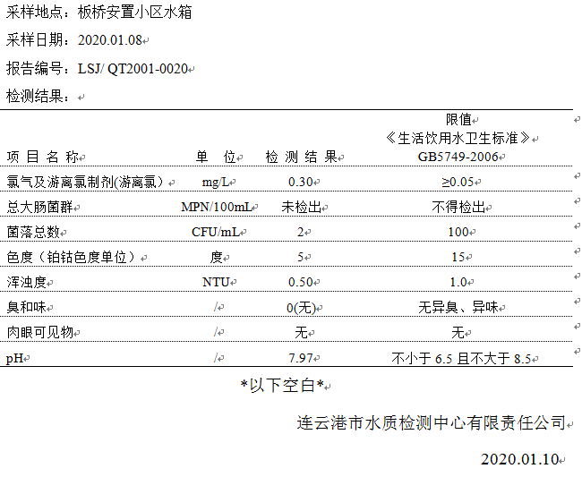 2020年1月二次供水泵房水質公示
