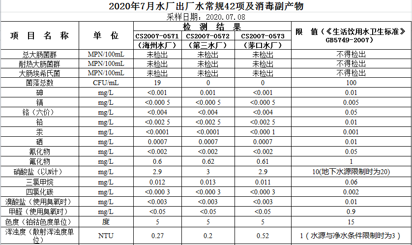 2020年7月出廠水常規(guī)42項(xiàng)及消毒副產(chǎn)物
