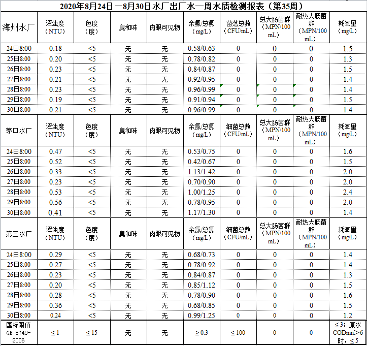 2020年8月24日—8月30日出廠水水質公示