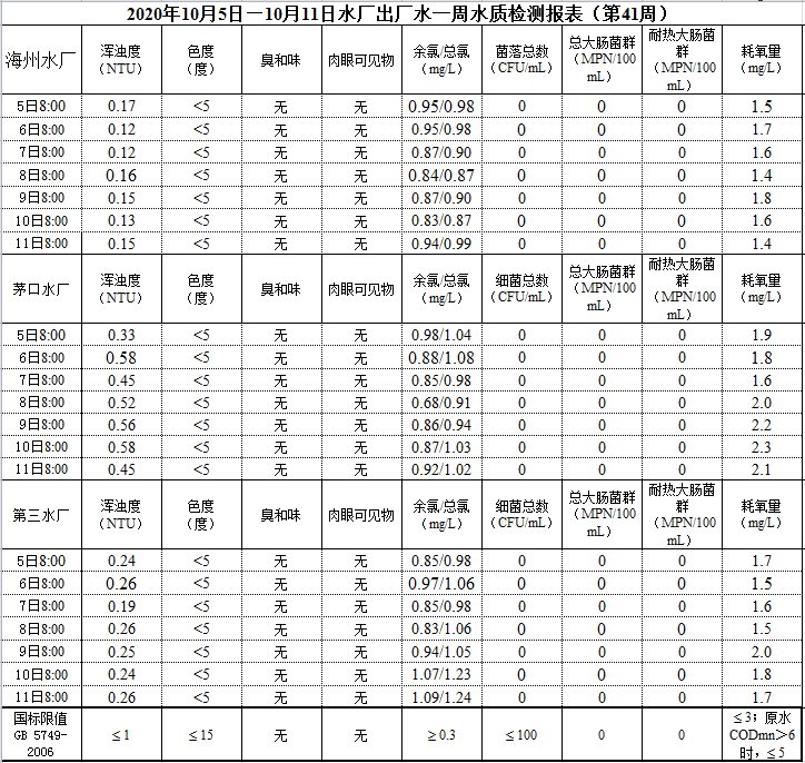 2020年10月5日—10月11日出廠水水質(zhì)公示