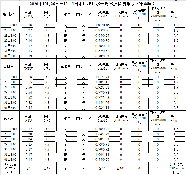 2020年10月26日—11月1日出廠水水質公示