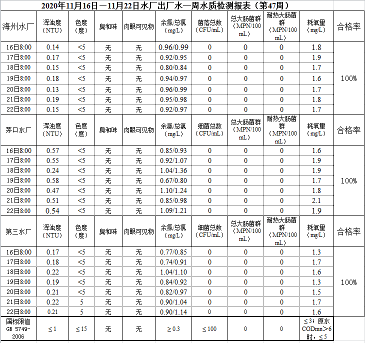 2020年11月16日—11月22日出廠水水質(zhì)公示