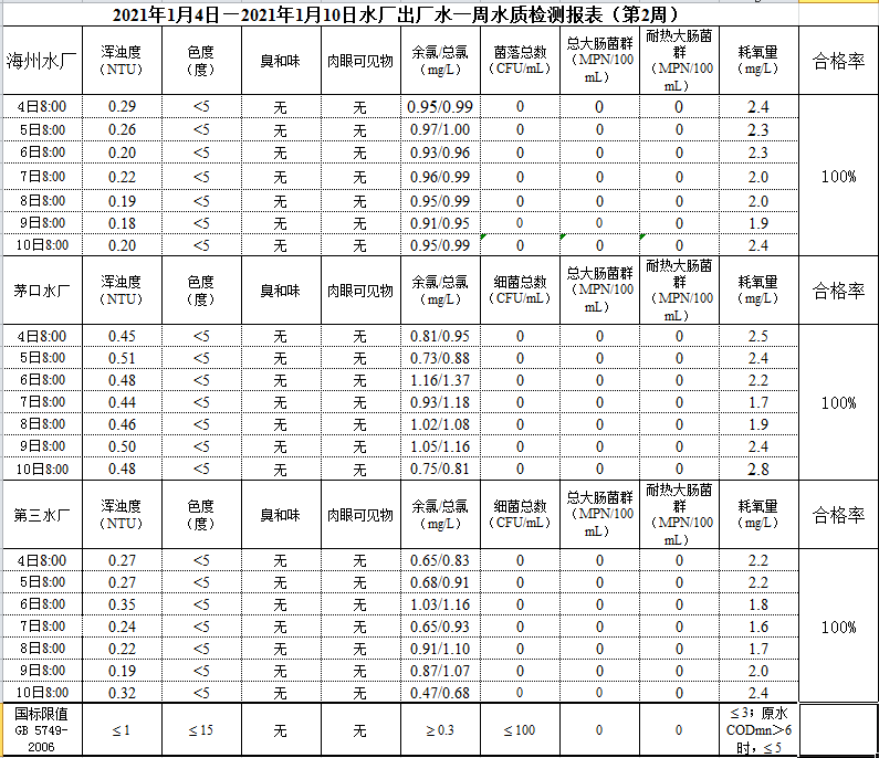 2021年1月4日—1月10日出廠水水質(zhì)公示