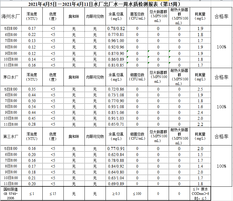 2021年4月5日—4月11日出廠水水質公示