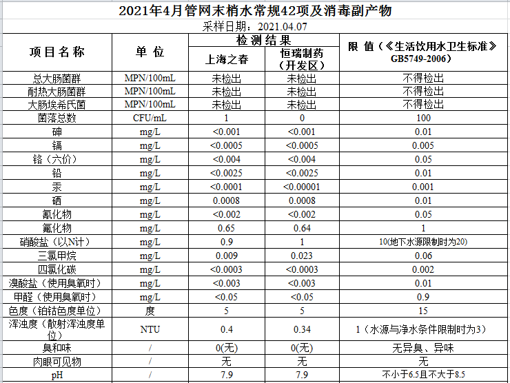 2021年4月管網水水質公示