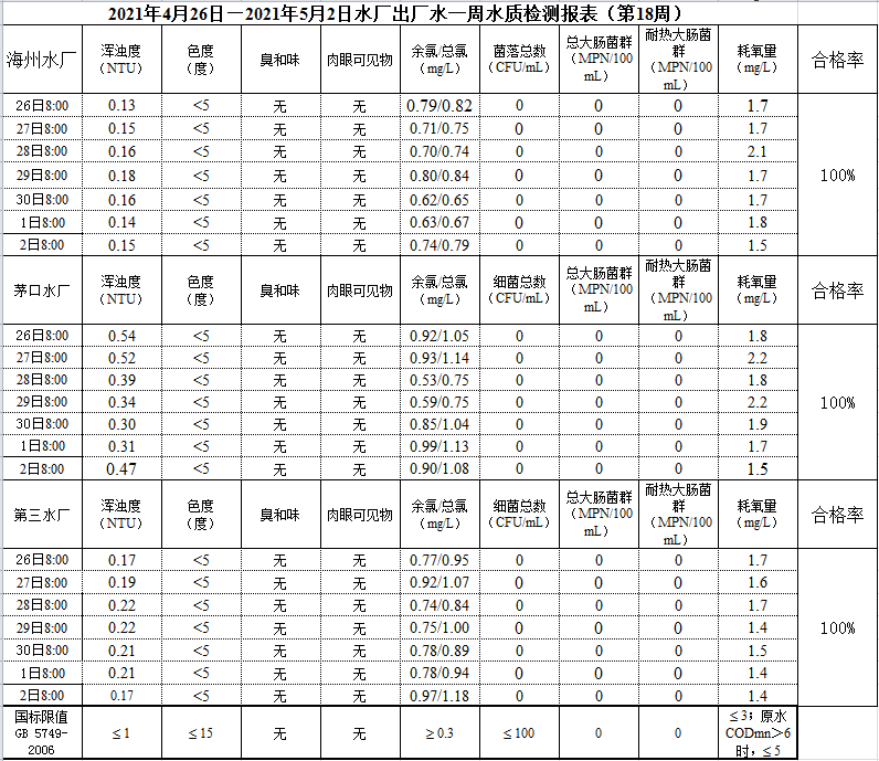 2021年4月26日—5月2日出廠水水質(zhì)公示