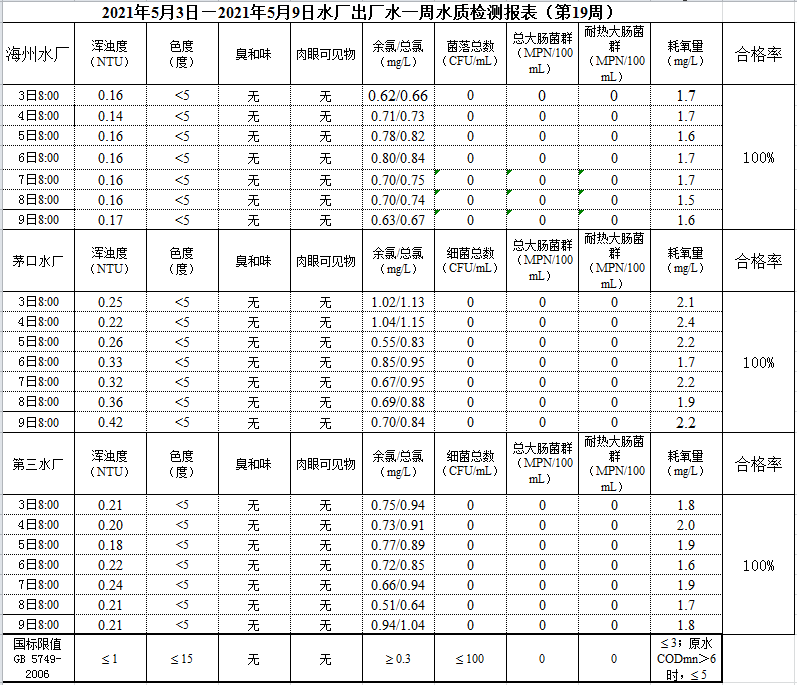 2021年5月3日—5月9日出廠水水質(zhì)公示