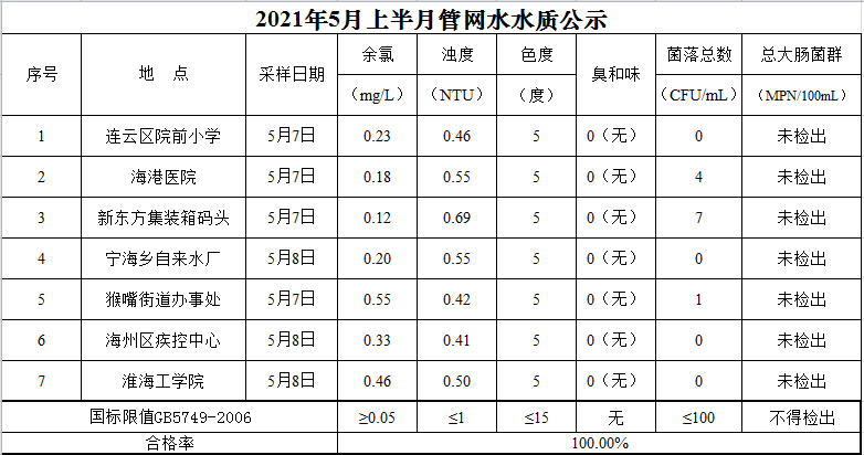 2021年5月上半月管網(wǎng)水水質(zhì)公示