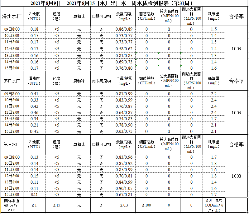 2021年8月9日—8月15日出廠水水質公示
