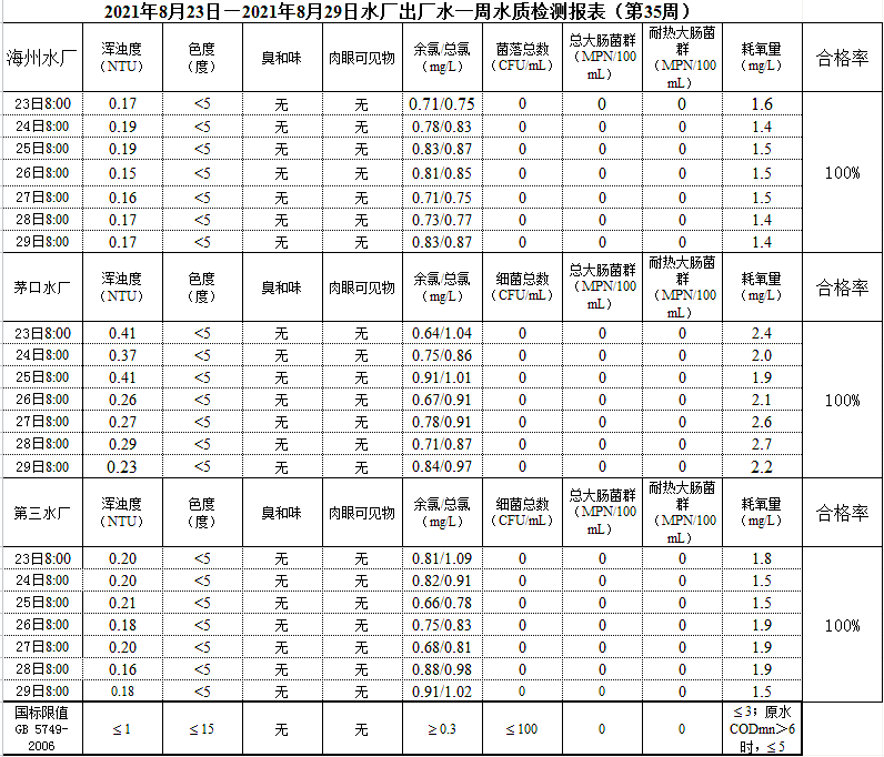 2021年8月23日—8月29日出廠水水質(zhì)公示