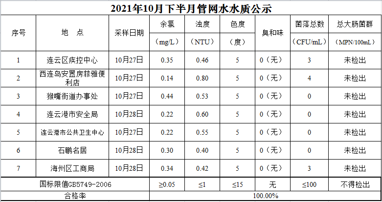 2021年10月下半月管網(wǎng)水水質(zhì)公示