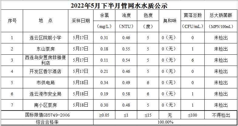 2022年5月下半月管網(wǎng)水水質(zhì)公示