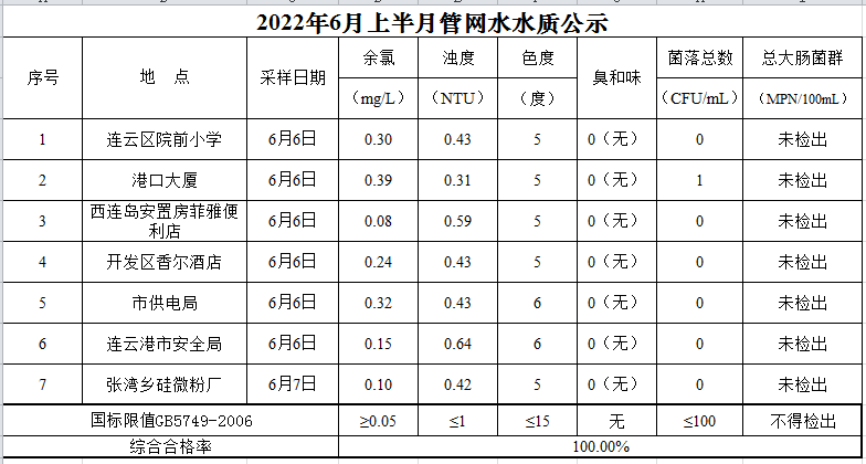 2022年6月上半月管網(wǎng)水水質(zhì)公示