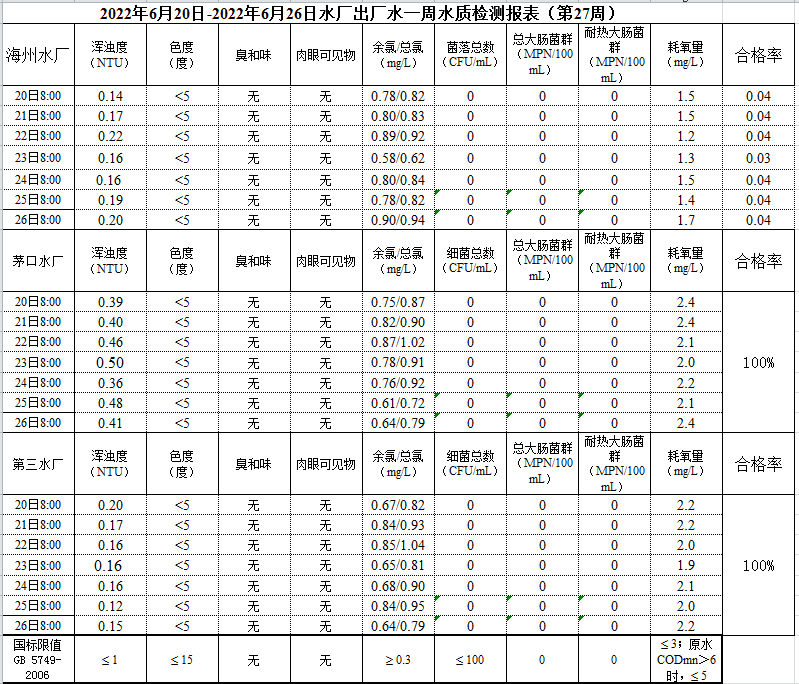 2022年6月20日—6月26日出廠水水質公示