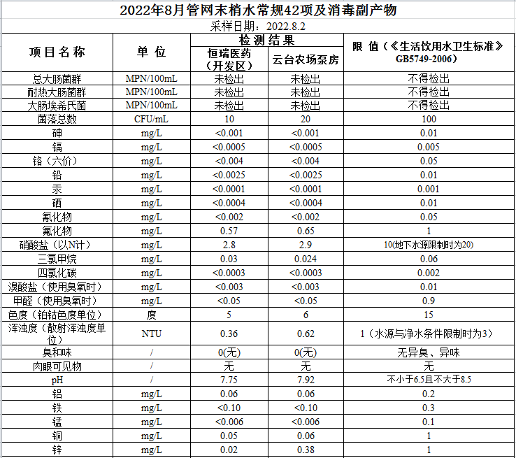 2022年8月份管網(wǎng)水水質(zhì)公示