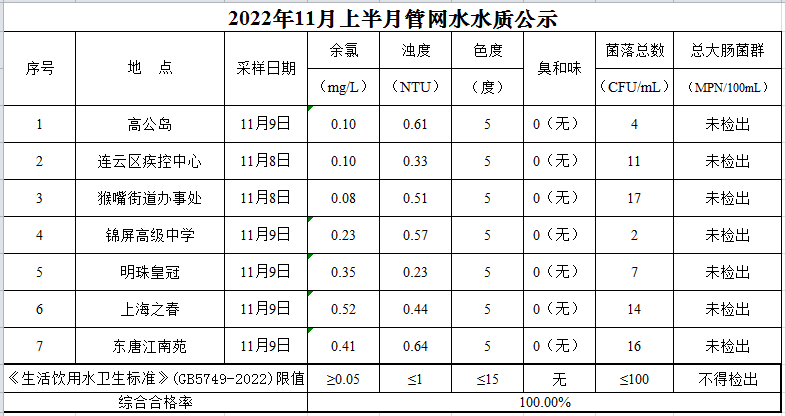 2022年11月上半月管網(wǎng)水水質(zhì)公示