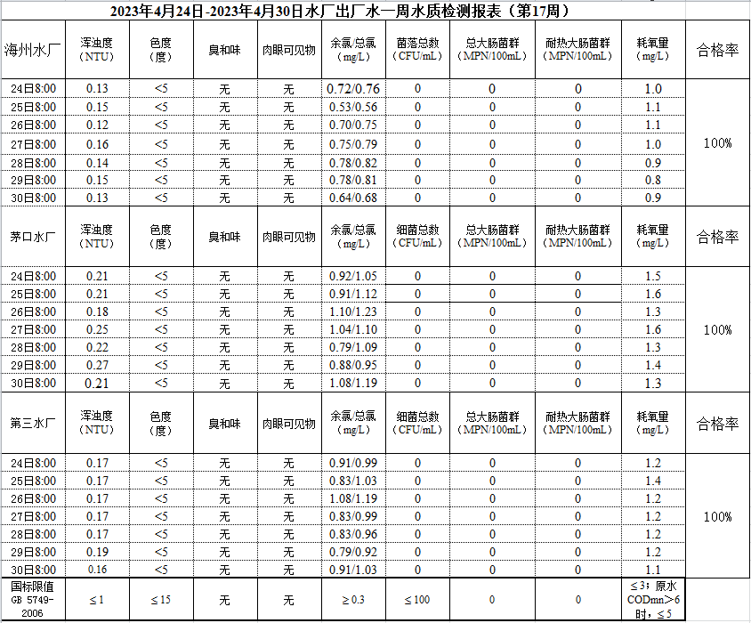 2023年4月24日—4月30日出廠水水質公示
