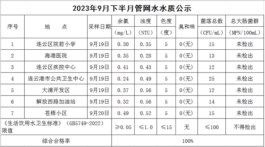 2023年9月下半月管網(wǎng)水水質(zhì)公示