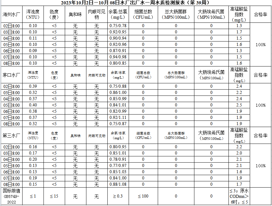 2023年10月2日—10月8日出廠水水質公示