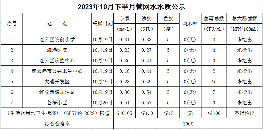 2023年10月下半月管網(wǎng)水水質(zhì)公示