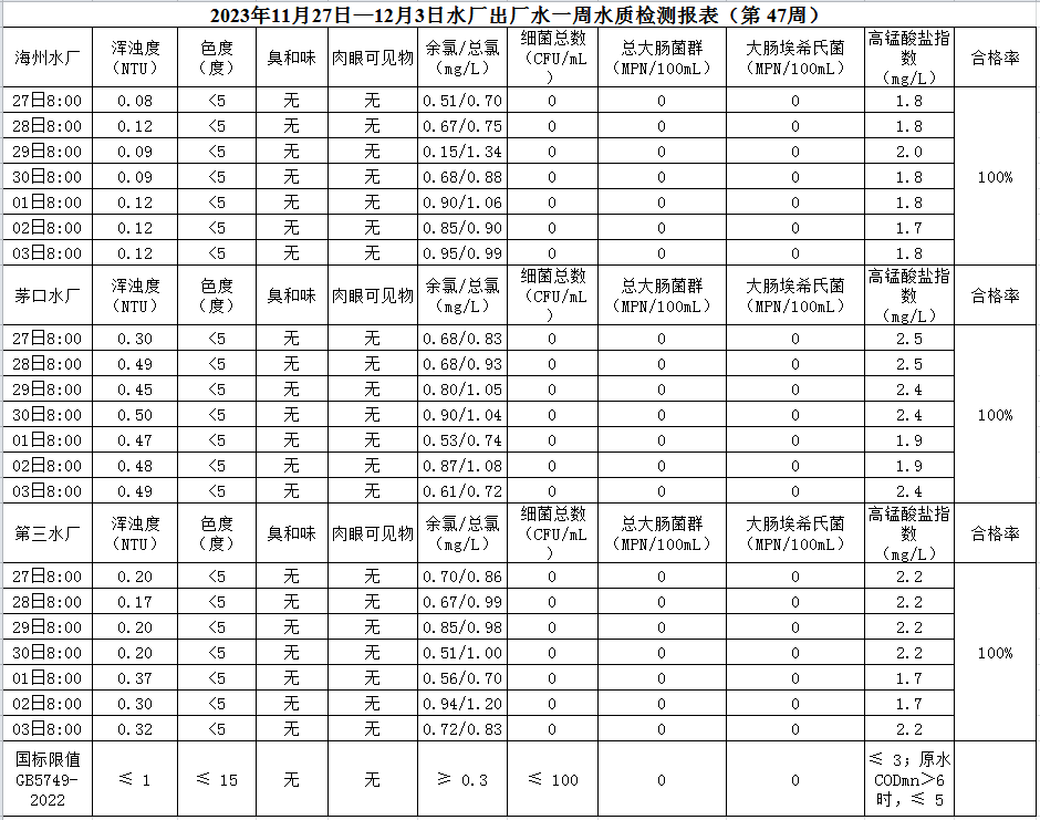 2023年11月27日—12月3日出廠水水質公示