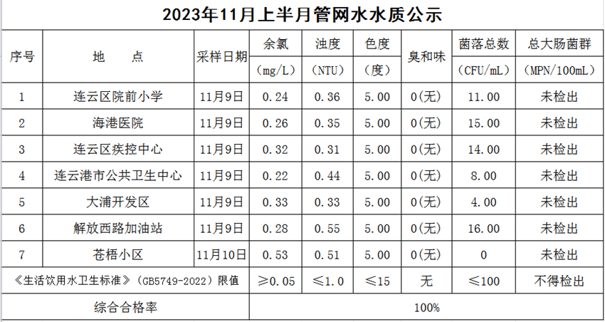2023年11月上半月管網(wǎng)水水質(zhì)公示