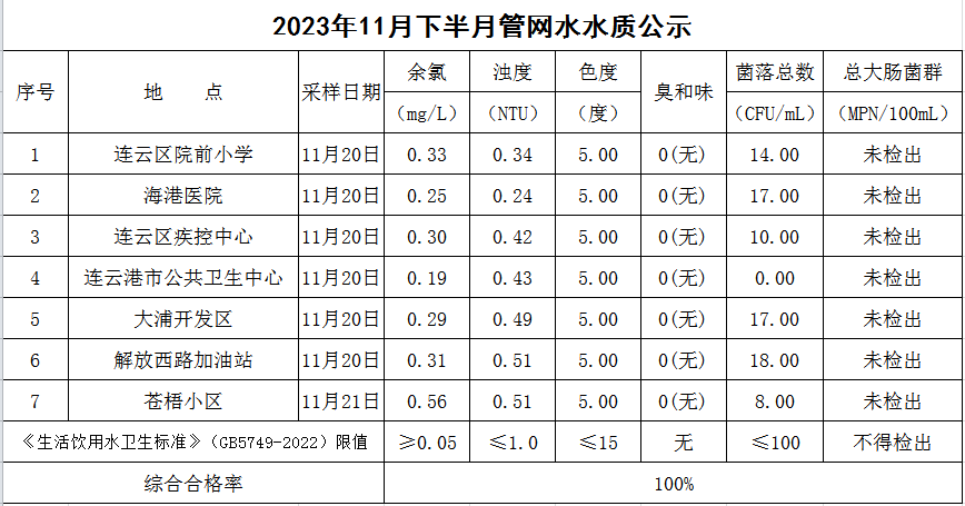 2023年11月下半月管網(wǎng)水水質(zhì)公示