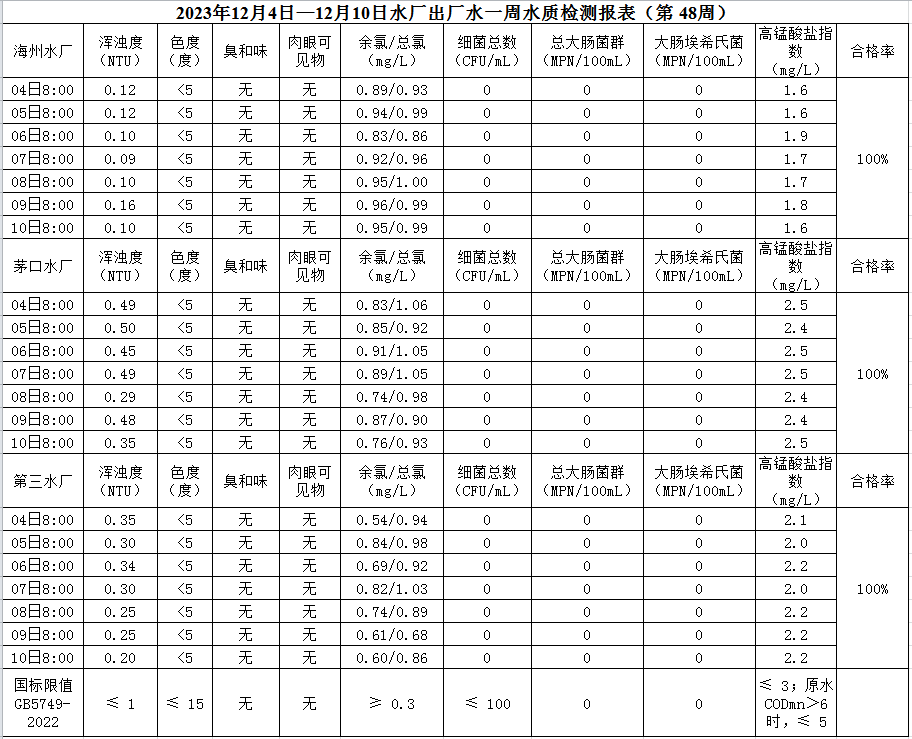 2023年12月4日—12月10日出廠(chǎng)水水質(zhì)公示