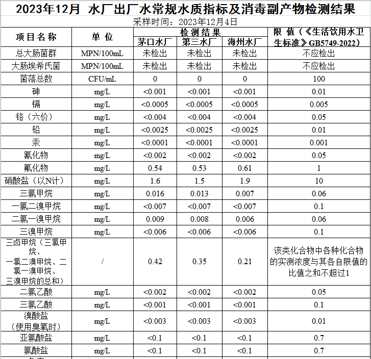 2023年12月份出廠水水質公示