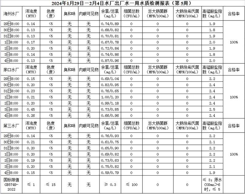2024年1月29日—2月4日出廠水水質(zhì)公示
