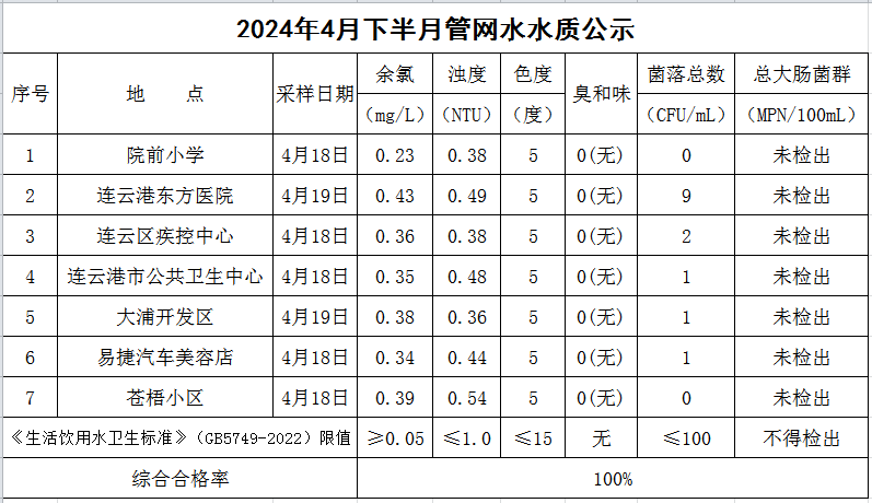 2024年4月下半月管網(wǎng)水水質(zhì)公示