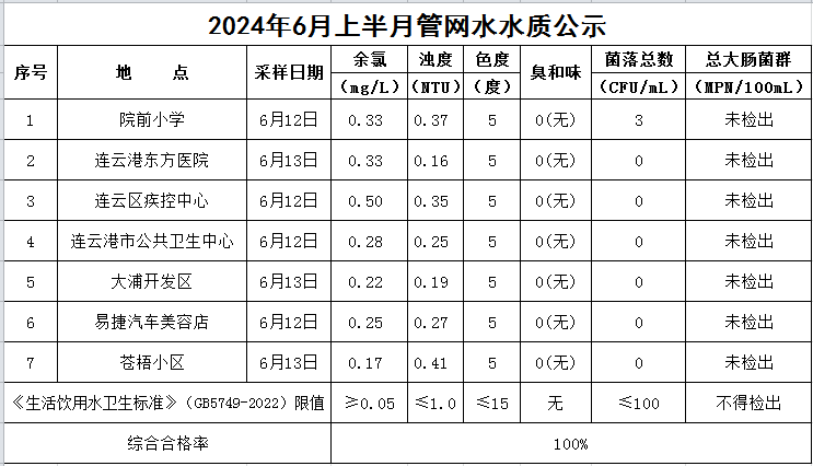 2024年6月上半月管網(wǎng)水水質(zhì)公示