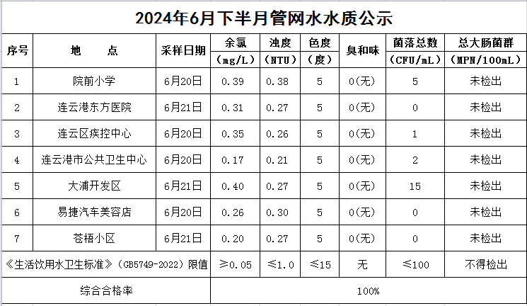 2024年6月下半月管網水水質公示