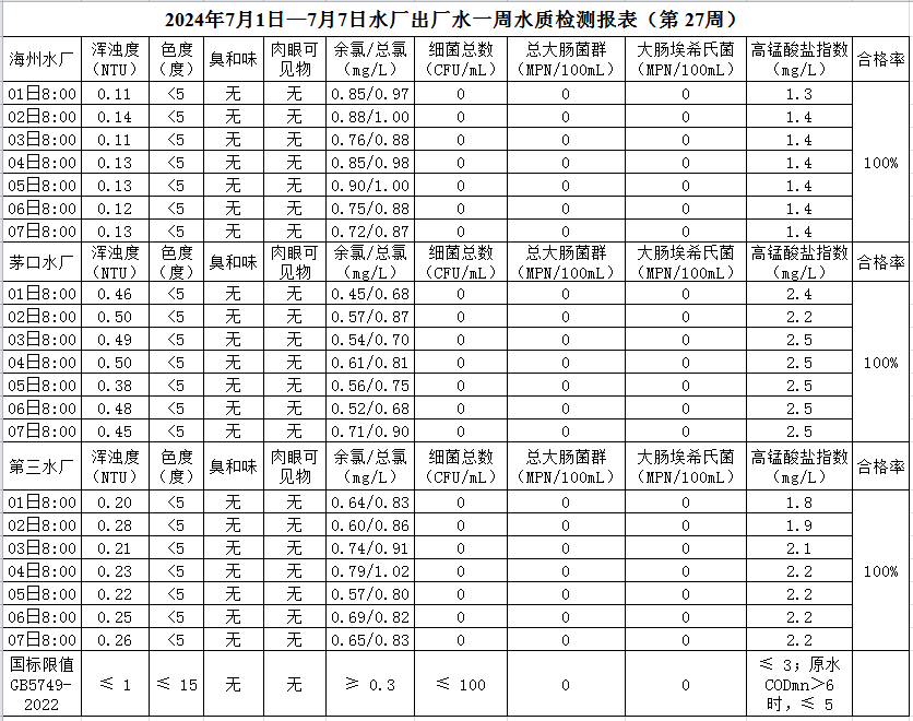 2024年7月1日—7月7日出廠水水質(zhì)公示