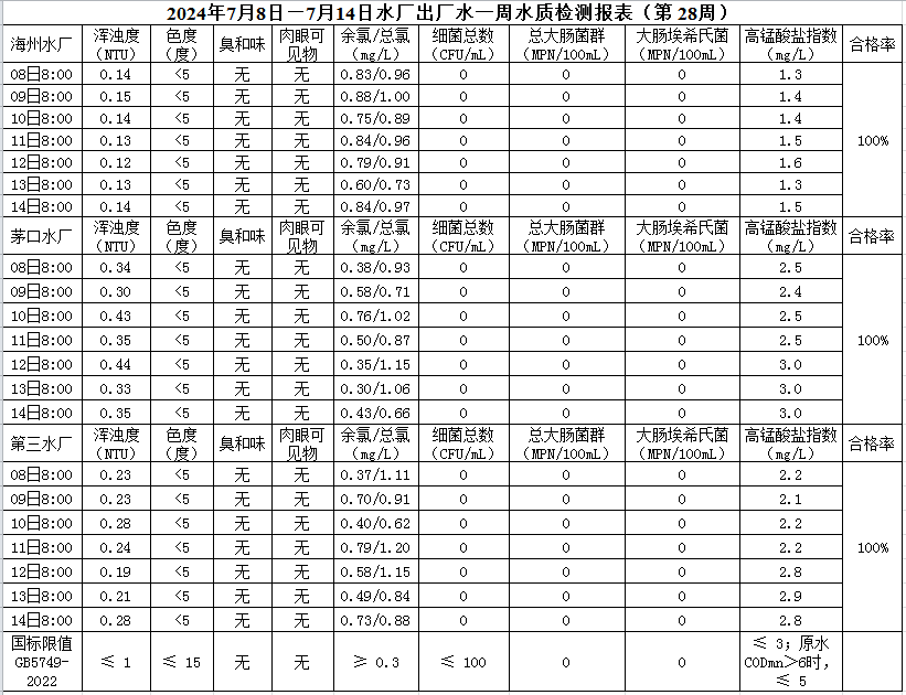2024年7月8日—7月14日出廠水水質(zhì)公示
