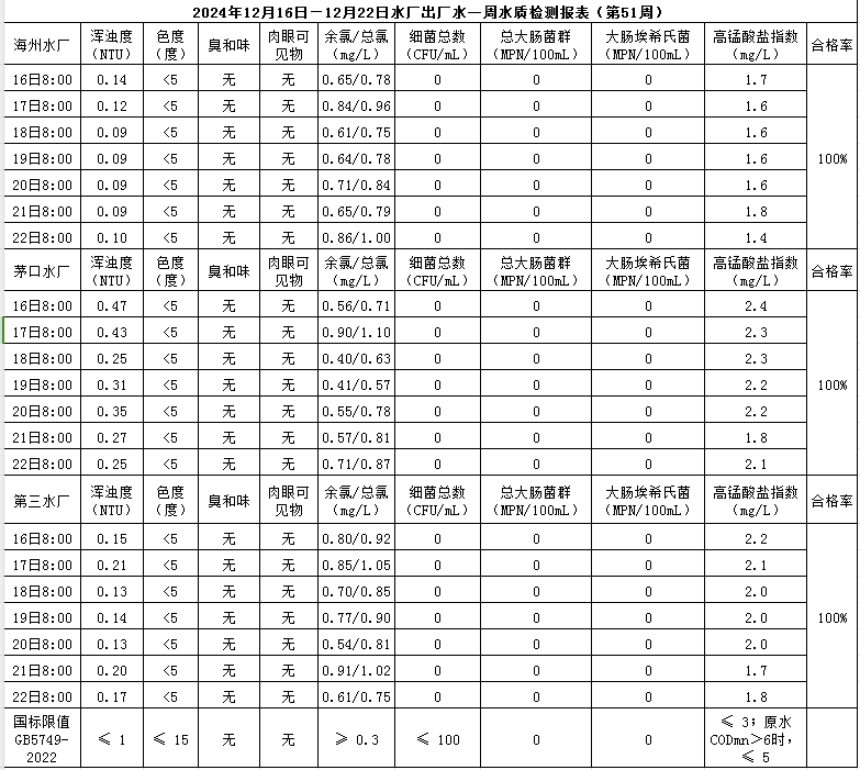 2024年12月16日——12月22日出廠水水質(zhì)公示