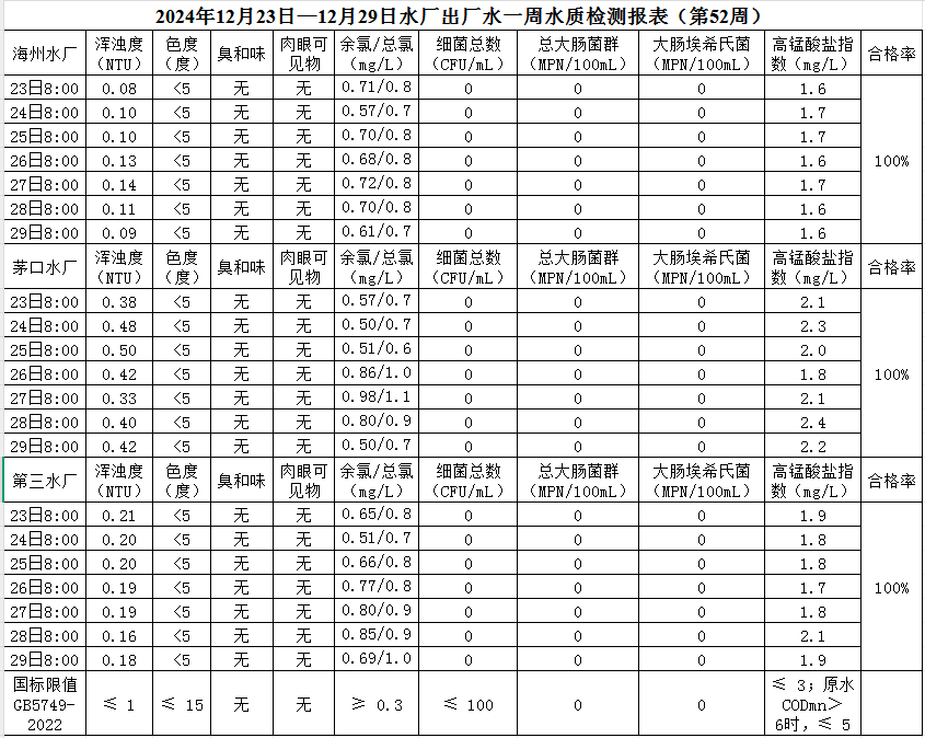 2024年12月23日——12月29日出廠水水質公示