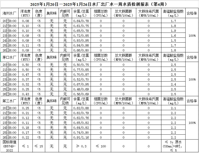 2025年1月20日——1月26日出廠水水質(zhì)公示