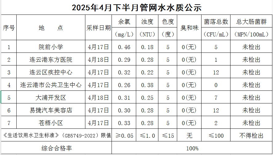2025年4月下半月管網(wǎng)水水質(zhì)公司