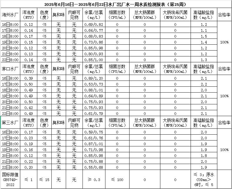 2025年6月16日——6月22日出廠水水質公示