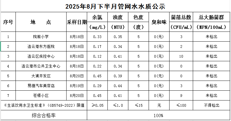 2025年8月下半月管網水水質公司